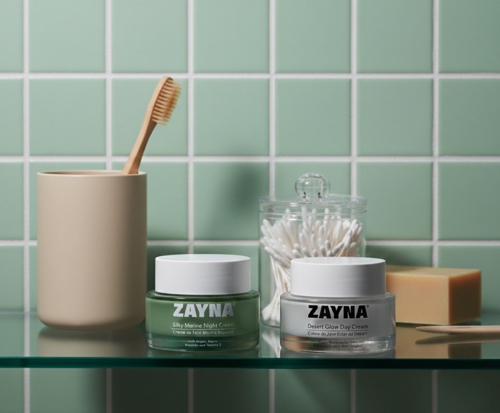 A complete day & night routine: Desert Glow Day Cream and Silky Marine Night Cream from the Sable et Mer® collection, crafted with argan oil, botanical extracts and Swiss-made care.